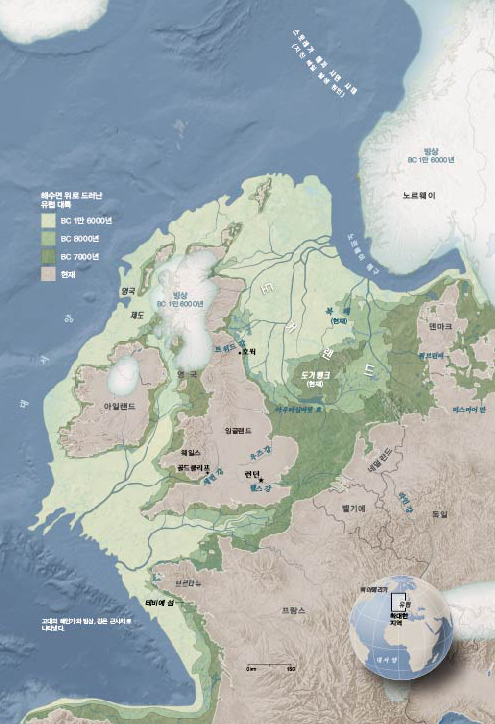 아래 책의 지도를 한참 들여다 보았습니다. 중국, 한반도와 일본이 육지로 연결되어 있었듯이, 유럽대륙과 영국이 도거랜드로 연결되어 있었다고 합니다.